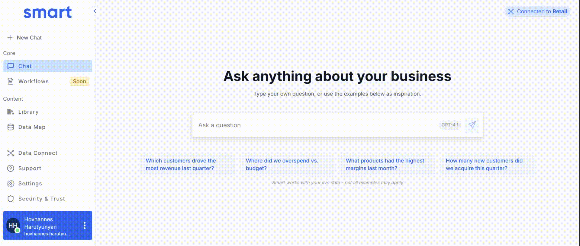 Smart connects to your database and learns your data structure, business logic, and key metrics. Smart instantly starts delivering context-aware insights grounded in your business logic.